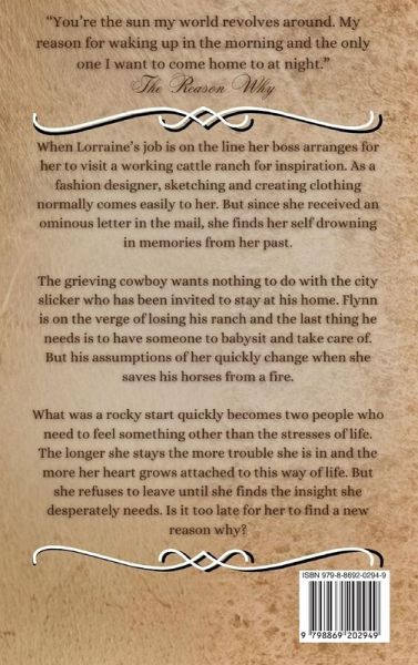 When Lorraine's job is on the line her boss arranges for her to visit a working cattle ranch for inspiration. As a fashion designer, sketching and creating clothing normally comes easily to her. But since she received an ominous letter in the mail, she finds her self drowning in memories from her past. The grieving cowboy wants nothing to do with the city slicker who has been invited to stay at his home. Flynn is on the verge of losing his ranch and the last thing he needs is to have someone to babysit and take care of. But his assumptions of her quickly change when she saves his horses from a fire. What was a rocky start quickly becomes two people who need to feel something other than the stresses of life. The longer she stays the more trouble she is and more her heart grows attached to this way of life. But she refuses to leave until she finds the insight she desperately needs. Is it too late for her to find a new reason why?