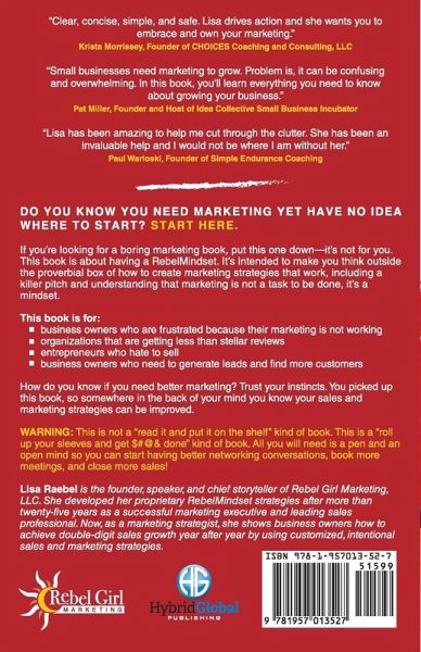 Ever feel like you're just committing random acts of marketing? Do you know you need marketing yet have NO IDEA where to start? Start here. If you're looking for a boring business book, put this one down-it's not for you. This book is about having a RebelMindset and intended to make you think outside the proverbial box of how you create your sales and marketing strategies, considering what marketing is and what it is not. This book is for: ¿business owners who are frustrated because their marketing is not working ¿organizations that are getting less than stellar reviews ¿entrepreneurs who hate to sell ¿business owners who need to generate leads and find more customers How do you know if you need better marketing? Trust your instincts. You picked up this book, so somewhere in the back of your mind you know your sales and marketing strategies can be improved. At its core, marketing is perception. The hard part is knowing the who, how, when, why, and where to build that perspective! For example: do you know what your voicemail greeting sounds like to a customer? Is it welcoming and inviting for them to leave a message? Or does it sound like you are rushed and just too busy to bother answering the phone when they call? Still not sure this book is for you? Ask yourself this: do you know how you and your organization is being perceived by your customers, prospects, network, and your team? WARNING: As you read this book, you'll need a pen. The content is intended to be interactive. Each chapter has a downloadable PDF worksheet for you to fill-in so you can take what you learn and customize it to you and your organization. The old saying is that "you cannot see the forest for the trees." Let me be your guide out of the marketing wilderness and help you create sales and marketing strategies that work!