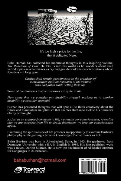 Bahaa Burhan has collected his innermost thoughts in this inspiring volume, The Rebellion of Fear. He lets us into his world as he wonders about such varied topics as what makes us cry and grandeur of ancient civilizations whose founders are long gone. Castles shall remain eyewitnesses to the grandeur of a civilization built on remnants of the victims who had fallen while setting them up. Some of the moments that he discusses are quite ironic: How come that we consider our disability strength pushing us to another disability we consider strength? Burham has presented thoughts that will spur all to think creatively about the future and to maintain an optimism that enables Burham to look to his future for clarity of thought. As fast as an escapee from death to life, we regain our consciousness, to realize that we are escapees from life to death; thereupon, we lose our consciousness again. Examining the spiritual side of life presents an opportunity to examine Burhan's philosophy while gaining a broader knowledge of what makes us tick.