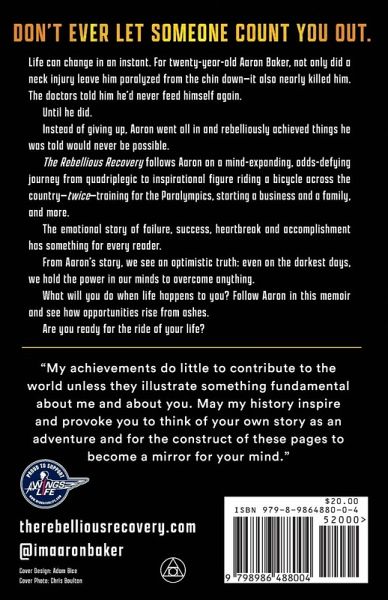 DON'T EVER LET SOMEONE COUNT YOU OUT. Life can change in an instant. For twenty-year-old Aaron Baker, not only did a neck injury leave him paralyzed from the chin down-it also nearly killed him. The doctors told him he'd never feed himself again. Until he did. Instead of giving up, Aaron went all in and rebelliously achieved things he was told would never be possible. The Rebellious Recovery follows Aaron on a mind-expanding, odds-defying journey from quadriplegic to inspirational figure riding a bicycle across the country-twice-training for the Paralympics, starting a business and a family, and more. The emotional story of failure, success, heartbreak and accomplishment has something for every reader. From Aaron's story, we see an optimistic truth: even on the darkest days, we hold the power in our minds to overcome anything. What will you do when life happens to you? Follow Aaron in this memoir and see how opportunities rise from ashes. Are you ready for the ride of your life?