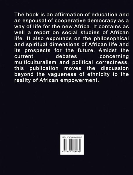 The book is an affirmation of education and an espousal of cooperative democracy as a way of life for the new Africa. It contains as well a report on social studies of African life. It also expounds on the philosophical and spiritual dimensions of African life and its prospects for the future. Amidst the current debates concerning multiculturalism and political correctness, this publication moves the discussion beyond the vagueness of ethnicity to the reality of African empowerment.