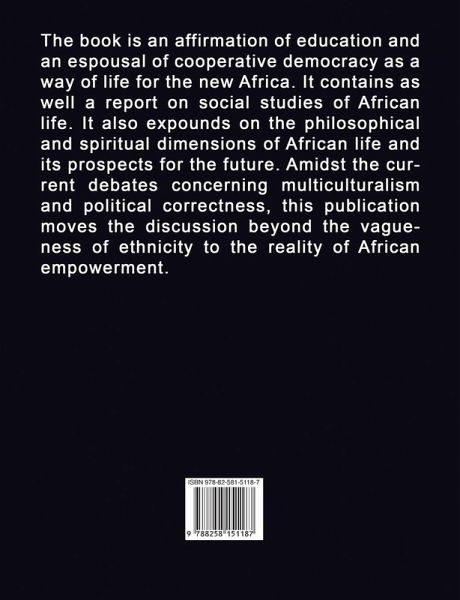 The book is an affirmation of education and an espousal of cooperative democracy as a way of life for the new Africa. It contains as well a report on social studies of African life. It also expounds on the philosophical and spiritual dimensions of African life and its prospects for the future. Amidst the current debates concerning multiculturalism and political correctness, this publication moves the discussion beyond the vagueness of ethnicity to the reality of African empowerment.