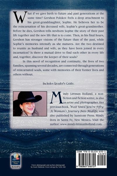 What if we gave birth to future and past generations at the same time? Gershon Polokov feels a deep attachment to his great granddaughter, Sophie. He believes her to be the reincarnation of his deceased wife, Sophie's great grandmother. Before he dies, Gershon tells newborn Sophie the story of their past life together and the new life that is to come. Then, in his final hours, Gershon has stronger visions of the future than of the past, while Sophie's memories intensify as she matures. Are the two destined to reunite as husband and wife, as they have been joined in every incarnation? Is there a mutual drive to find each other in every life and, together, discover the keeper of their souls? In this novel of recognition and continuity, the lives of two families, spanning several decades, are connected through generations of reincarnated souls, some with memories of their former lives and others without. Includes Reader's Guide. MINDY LITTMAN HOLLAND, a nonfiction and fiction writer, is also an artist and photographer. Her previous book, "Wait Until You're Fifty: A Woman's Journey Into Midlife," was also published by Sunstone press. Mindy lives in Santa Fe, New Mexico.