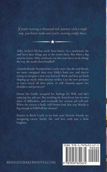 If you're starting a thousand mile journey with a single step, you better make sure you're wearing comfy shoes. Abby Archer's life has rarely been better. As a newlywed, she and Steve have things just as she wants them. But when a big surprise leaves Abby confused, can she trust Steve to do things the way she needs them handled? Amanda Brooks' business had a rocky start, but she and Mandy are more energized than ever. Eddy's back too, and they're trying to navigate a new way forward. Work and love are both shaping up nicely when disaster strikes. Can the new presence in town wreck all their plans, or will Amanda square her shoulders and persevere? Donna has finally accepted her feelings for Will, and she's enjoying her job too. But working far from home has its own share of difficulties, and eventually her current job will end. When the retreat is built, will Donna find that tiny Manila is big enough to fulfill all her dreams? Return to Birch Creek to see how your favorite friends are navigating career, family life, and love with a little bit of laughter.