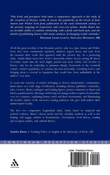 Of all the great novelists of the Romantic period, only two, Jane Austen and Walter Scott, have been continuously reprinted, admired, argued about, and read, from the moment their works first appeared until the present day. In a pioneering study, Annika Bautz traces how Scott's nineteenth-century success among all classes of readers made him the most admired and most widely read novelist in history, only for his readership to plummet sharply downwards in the twentieth century. Austen's popularity, by contrast, has risen inexorably, overtaking Scott's, and bringing about a reversal in reputation that would have been unthinkable in the authors' own time. To assess the reactions of readers belonging to diverse interpretative communities, Bautz draws on a wide range of indicators, including editions, publisher's relaunches, sales, reviews, library catalogues and lending figures, private comments in diaries and letters, popularisations. She maps out the long-run changes in the reception of each author over two centuries, explaining literary tastes and their determinants, and illuminating the broader culture of the successive reading audiences who gave both authors their uninterrupted loyalty. The first ever comparative longitudinal study, firmly based on empirical and archival evidence, this book will be of interest to scholars in Romanticism, Victorianism, book history, reading and reception studies, and cultural history.
