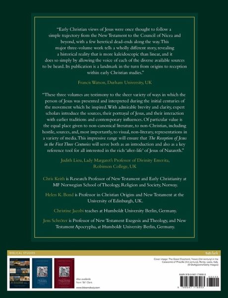 The first three centuries were the formative period of Christianity. The developments during this time led to the distinction of canonical and non-canonical writings, to organizational structures of the Christian church, and to the establishment of the Christian creed. In The Reception of the Jesus in the First Three Centuries Chris Keith, Helen K. Bond, Christine Jacobi and Jens Schröter have collated a methodologically sophisticated resource. These volumes focus upon the diversity of reception of the Jesus tradition in this time period, highlighting the complex interactions between the inherited past and the present in which it is received. Rather than address texts specifically as canonical or non-canonical, the volumes show the more complex reality of attitudes towards and within early Christianity. Core literary texts such as Gospels and other early Christian writings are discussed in detail, but the volumes also highlight the importance of Jesus tradition in literary and non-literary contexts outside the gospel genre; including the Apostolic Fathers, patristic writers, traditions such as the Abgar Legend, and modifications to the gospel genre such as the Diatesseron. Evidence from material culture, such as pictographic representations of Jesus in the staurogram and Alexamenos Graffito, as well as visual presentations of gospel tradition in sarcophagi carvings, are also included in order to fully reflect the transmission and reception of the Jesus tradition. Volume 3 examines visual, liturgical and non-Christian receptions of Jesus in the second and third centuries, across 24 chapters. Methodologically the volumes draw on new approaches to history, memory, and tradition, to provide a cutting-edge approach that focuses upon reception-history rather than the putative actual past. This cutting-edge reference resource provides a fresh and comprehensive account of the complex development of early Christian thought about Jesus. It will fuel future discussions of early Christian history, the historical Jesus, the development of the New Testament canon, and non-canonical Jesus traditions for years to come.