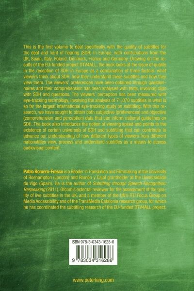 This is the first volume to deal specifically with the quality of subtitles for the deaf and hard of hearing (SDH) in Europe, with contributions from the UK, Spain, Italy, Poland, Denmark, France and Germany. Drawing on the results of the EU-funded project DTV4ALL, the book looks at the issue of quality in the reception of SDH in Europe as a combination of three factors: what viewers think about SDH, how they understand these subtitles and how they view them. The viewers' preferences have been obtained through questionnaires and their comprehension has been analysed with tests, involving clips with SDH and questions. The viewers' perception has been measured with eye-tracking technology, involving the analysis of 71,070 subtitles in what is so far the largest international eye-tracking study on subtitling. With this research, we have sought to obtain both subjective (preferences) and objective (comprehension and perception) data that can inform national guidelines on SDH. The book also introduces the notion of viewing speed and points to the existence of certain universals of SDH and subtitling that can contribute to advance our understanding of how different types of viewers from different nationalities view, process and understand subtitles as a means to access audiovisual content.