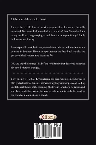 It was because of their stupid choices. I was a freak child, but not until everyone else like me was brutally murdered. No one really knew who I was, and thats how I intended for it to stay, until I was caught trying to steal from the most prolific royal family in documented history. It was especially terrible for me. Not only was I the second most notorious criminal in Southern Hilton (my partner was the first) but I was also the girl people had scoured two countries for. Oh, and the whole image I had of the royal family that destroyed mine was about to be forever changed.