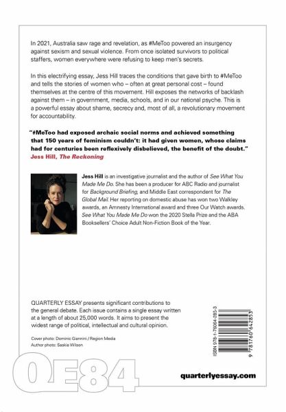 Tracing the impact of Australia's #MeToo moment This year, Australia's #MeToo moment erupted in the national parliament. In this electrifying essay, Jess Hill, the acclaimed author of See What You Made Me Do, traces the meaning of those events and what could happen next. What are the politics of rage? What couldn't Scott Morrison see? And what hope is there of real progress and accountability? Hill examines how the law, the media and politics can bring about - or stall - change. She shows how when #MeToo meets patriarchy, the results are unpredictable - from lasting reform to backlash. And she asks whether a conservative prime minister can do what is required to meet the moment.