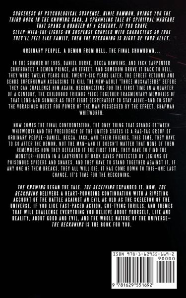 Sorceress of psychological suspense, Ninie Hammon, brings you the third book in The Knowing Saga, a sprawling tale of spiritual warfare that spans a quarter of a century. If you crave sleep-with-the-lights-on suspense coupled with characters so true they'll feel like family then, The Reckoning is right up your alley. Ordinary people. A demon from hell. The final showdown... In the summer of 1985, Daniel Burke, Becca Hawkins, and Jack Carpenter confronted a demon prince, an efreet, and somehow drove it back to hell. They were twelve years old. Twenty-six years later, the efreet returns and sends superhuman assassins to kill the now-adult "Three Muskateers" before they can challenge him again. Reconnecting for the first time in a quarter of a century, the childhood friends piece together fragmentary memories of that long-ago summer as they fight desperately to stay alive-and to stop the voracious quest for power of the man possessed by the efreet, Chapman Whitworth. Now comes the final confrontation. The only thing that stands between Whitworth and the presidency of the United States is a rag-tag group of ordinary people-Daniel, Becca, Jack, and their friends. This time, they have to go after the demon, not the man-and it doesn't matter that none of them remembers how they defeated it the first time. They have to find the monster-hidden in a labyrinth of dark caves protected by legions of poisonous spiders and snakes. And they have to stand together against it. If any one of them breaks, they all will die. It has come down to this-one last chance. It's time for the reckoning. The Knowing began the tale. The Deceiving expanded it. Now, The Reckoning delivers a heart-pounding continuation with a riveting account of the battle against an evil as old as the skeleton of the universe. If you like fast-paced action, gut-tying thrills, and themes that will challenge everything you believe about yourself, life and reality, about good and evil, and the whole nature of the universe-The Reckoning is the book for you.