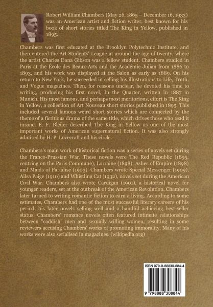 Historical Fiction set during the Revolutionary War in northern New England. The Protagonist is a spy in New York during a significant part of the war, then uses his intimate knowledge of the Native American Indians to aid the war effort during the latter part of the war. A romance is woven into the story, and the writing style is that of the late 1800's early 1900's. If one does not find the language style too challenging the book is well written and enjoyable. Recommended. (Newell) About the author: Robert William Chambers (May 26, 1865 - December 16, 1933) was an American artist and fiction writer, best known for his book of short stories titled The King in Yellow, published in 1895. Chambers was first educated at the Brooklyn Polytechnic Institute, and then entered the Art Students' League at around the age of twenty, where the artist Charles Dana Gibson was a fellow student. his work was displayed at the Salon as early as 1889. On his return to New York, he succeeded in selling his illustrations to Life, Truth, and Vogue magazines. Then, for reasons unclear, he devoted his time to writing, producing his first novel, In the Quarter, written in 1887 in Munich. His most famous, and perhaps most meritorious, effort is The King in Yellow, a collection of Art Nouveau short stories published in 1895. This included several famous weird short stories which are connected by the theme of a fictitious drama of the same title, which drives those who read it insane. E. F. Bleiler described The King in Yellow as one of the most important works of American supernatural fiction. It was also strongly admired by H. P. Lovecraft and his circle. Chambers's main work of historical fiction was a series of novels set during the Franco-Prussian War. These novels were The Red Republic (1895, centring on the Paris Commune), Lorraine (1898), Ashes of Empire (1898) and Maids of Paradise (1903). Chambers wrote Special Messenger (1909), Ailsa Paige (1910) and Whistling Cat (1932), novels set during the American Civil War. Chambers also wrote Cardigan (1901), a historical novel for younger readers, set at the outbreak of the American Revolution. Chambers later turned to writing romantic fiction to earn a living. According to some estimates, Chambers had one of the most successful literary careers of his period, his later novels selling well and a handful achieving best-seller status. Chambers' romance novels often featured intimate relationships between "caddish" men and sexually willing women, resulting in some reviewers accusing Chambers' works of promoting immorality. Many of his works were also serialised in magazines. (wikipedia.org)