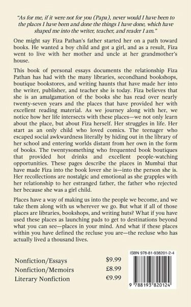 As for me, if it were not for you (Papa), never would I have been to the places I have been and done the things I have done, which have shaped me into the writer, teacher, and reader I am. One might say Fiza Pathan's father started her on a path toward books. He wanted a boy child and got a girl, and as a result, Fiza went to live with her mother and uncle at her grandmother's house. This book of personal essays documents the relationship Fiza Pathan has had with the many libraries, secondhand bookshops, boutique bookstores, and writing haunts that have made her into the writer, publisher, and teacher she is today. Fiza believes that she is an amalgamation of the books she has read over nearly twenty-seven years and the places that have provided her with excellent reading material. As we journey along with her, we notice how her life intersects with these places-we not only learn about the place, but about Fiza herself. Her struggles in life. Her start as an only child who loved comics. The teenager who escaped social awkwardness literally by hiding out in the library of her school and entering worlds distant from her own in the form of books. The twentysomething who frequented book boutiques that provided hot drinks and excellent people-watching opportunities. These pages describe the places in Mumbai that have made Fiza into the book lover she is-into the person she is. Her recollections are nostalgic and emotional as she grapples with her relationship to her estranged father, the father who rejected her because she was a girl child. Places have a way of making us into the people we become, and we take them along with us wherever we go. But what if all of those places are libraries, bookshops, and writing huts? What if you have used these places as launching pads to get to destinations beyond what you can see-places in your mind. And what if these places within you have defined the recluse you are-the recluse who has actually lived a thousand lives.