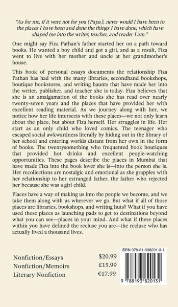 As for me, if it were not for you (Papa), never would I have been to the places I have been and done the things I have done, which have shaped me into the writer, teacher, and reader I am. One might say Fiza Pathan’s father started her on a path toward books. He wanted a boy child and got a girl, and as a result, Fiza went to live with her mother and uncle at her grandmother’s house. This book of personal essays documents the relationship Fiza Pathan has had with the many libraries, secondhand bookshops, boutique bookstores, and writing haunts that have made her into the writer, publisher, and teacher she is today. Fiza believes that she is an amalgamation of the books she has read over nearly twenty-seven years and the places that have provided her with excellent reading material. As we journey along with her, we notice how her life intersects with these places—we not only learn about the place, but about Fiza herself. Her struggles in life. Her start as an only child who loved comics. The teenager who escaped social awkwardness literally by hiding out in the library of her school and entering worlds distant from her own in the form of books. The twentysomething who frequented book boutiques that provided hot drinks and excellent people-watching opportunities. These pages describe the places in Mumbai that have made Fiza into the book lover she is—into the person she is. Her recollections are nostalgic and emotional as she grapples with her relationship to her estranged father, the father who rejected her because she was a girl child. Places have a way of making us into the people we become, and we take them along with us wherever we go. But what if all of those places are libraries, bookshops, and writing huts? What if you have used these places as launching pads to get to destinations beyond what you can see—places in your mind. And what if these places within you have defined the recluse you are—the recluse who has actually lived a thousand lives.