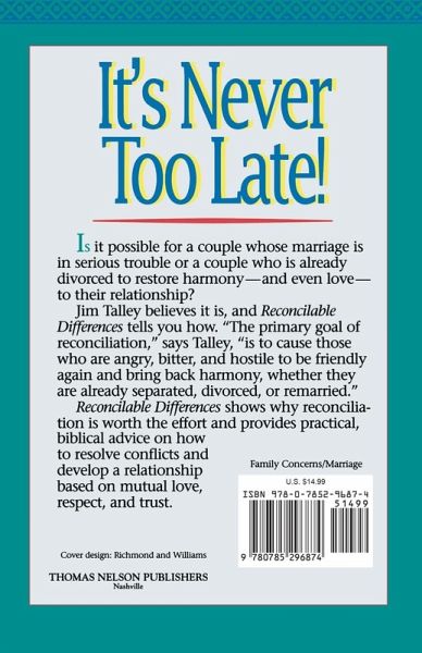 Is is possible for a couple whose marriage is in serious trouble or a couple who is already divorced to restore harmony -- and even love -- to their relationship? Jim Talley believes it is, and Reconcilable Differences shows why reconciliation is worth the effort. This book provides practical, biblical advice on how to resolve conflicts and develop a relationship based on mutual love, respect, and trust.