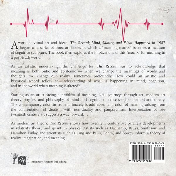 A work of visual art and ideas, The Record-Mind, Matter, and What Happened in 1987 begins as a series of three art books in which two stories are told using the ideographic code of two 'meaning matrices'. These have poetic content, but, as the book explains, are 'meaning environments', rather than poems. The meaning matrix that becomes the language of the story is presented in the preface for each of the first two books within the book - The Record of Gabrielle and The Orphan's Tale. ' Book III - Meaning Matrix Primer and Workbook' is a series of 'lessons' for anyone wishing to approach interpretation of the matrices more pedantically. The inception of the meaning matrix was in the art discourse, but it is informed by science. In 'Book V - An Experiment With Logs - The Meaning Matrix Meets Science', connections are made to conceptual metaphor theory, neuropsychology of categorization (pp.280-298), interaction of visual and linguistic processing (Spivey, p. 282); linguistic relativism (Whorf, Boroditsky, p.279); science of consciousness and panspychism: (Jung/Pauli, Bohm, Nelson, ..., pp.269-279+); science of the subject in time (Dunne, Schooler, ..., pp.254-269). Although the momentum and output of the process are subjective and creative, the form of the matrix is meant to test the impact on reality of shifts in meaning content of a network of concepts. There is the intent to move the reader towards the experience of subject/object unity. In 'Book IV: Book of Correspondences', and 'Book VI - Wind Angel Places: An Artist's Tale', the relevance of he meaning matrix to modern art is explored via connections to Duchamp, Beuys, Smithson, and Hamilton-Finlay. The role of art in the crisis of truth is elaborated, and modern art is interpreted as parallel processes of deconstruction and reconstruction. The meaning matrix is situated as reconstruction. The contemporary crisis in truth ultimately is addressed as a crisis of meaning arising from the confrontation of dualism with non-duality and panpsychism. Interpretation of late twentieth century art suggests a way forward.