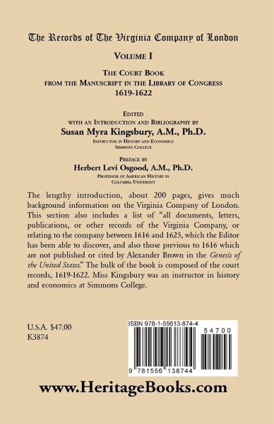 The lengthy introduction, about 200 pages, gives much background information on the Virginia Company of London. This section also includes a list of "all documents, letters, publications, or other records of the Virginia Company, or relating to the company between 1616 and 1625, which the Editor has been able to discover, and also those previous to 1616 which are not published or cited by Alexander Brown in the Genesis of the United States." The bulk of the book is composed of the court records, 1619-1622. Miss Kingsbury was an instructor in history and economics at Simmons College.