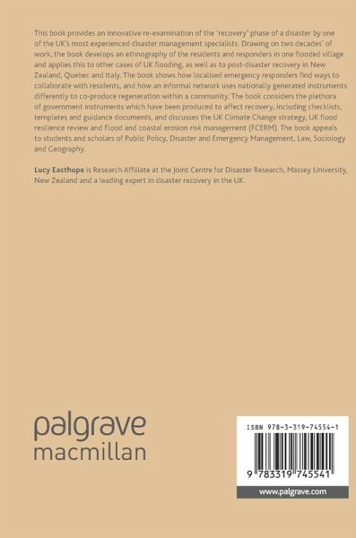 This book provides an innovative re-examination of the 'recovery' phase of a disaster by one of the UK's most experienced disaster management specialists. Drawing on two decades' of work, the book develops an ethnography of the residents and responders in one flooded village and applies this to other cases of UK flooding, as well as to post-disaster recovery in New Zealand. The book shows how localised emergency responders find ways to collaborate with residents, and how an informal network uses nationally generated instruments differently to co-produce regeneration within a community. The book considers the plethora of government instruments which have been produced to affect recovery, including checklists, templates and guidance documents, and discusses approaches to community resilience and recovery risk management. The book appeals to students and scholars of Government and Public Policy, Disaster and Emergency Management, Community Resilience, Law, Sociology and Geography.