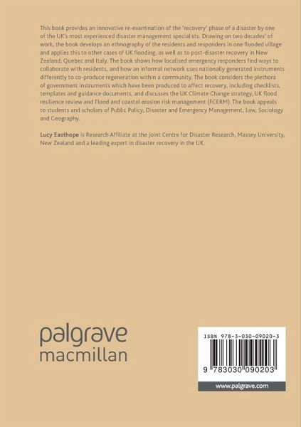 This book provides an innovative re-examination of the 'recovery' phase of a disaster by one of the UK's most experienced disaster management specialists. Drawing on two decades' of work, the book develops an ethnography of the residents and responders in one flooded village and applies this to other cases of UK flooding, as well as to post-disaster recovery in New Zealand. The book shows how localised emergency responders find ways to collaborate with residents, and how an informal network uses nationally generated instruments differently to co-produce regeneration within a community. The book considers the plethora of government instruments which have been produced to affect recovery, including checklists, templates and guidance documents, and discusses approaches to community resilience and recovery risk management. The book appeals to students and scholars of Government and Public Policy, Disaster and Emergency Management, Community Resilience, Law, Sociology and Geography.