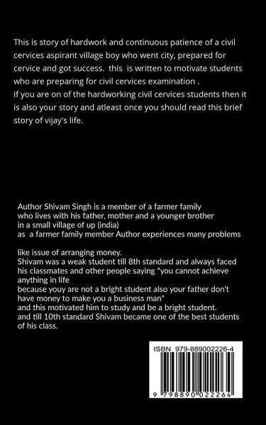 this book is story of a civil cervices aspirant villager boy who worked with his all effert to make his dreams true and support his family's economy. boy faced every problem of his way with much understanding and bravery he studied with all his energy and power and finally achieved his long lasting goal. it is much motivating story for every student who is preparing for civil cervices, who wants to be an IAS officer. if you are a civil cervices aspirant, you must read this once and draw inspiration from this story and its characters.