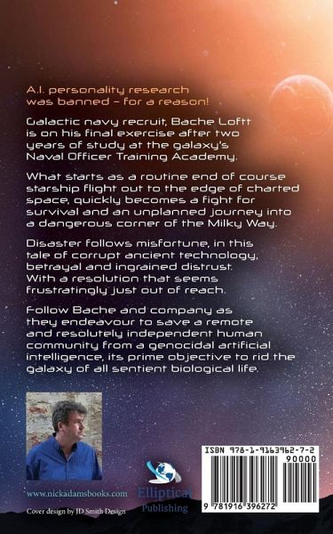 A.I. personality research was banned - for a reason! Galactic navy recruit, Bache Loftt is on his final exercise after two years of study at the galaxy's Naval Officer Training Academy. What starts as a routine end of course starship flight out to the edge of charted space, quickly becomes a fight for survival and an unplanned journey into a dangerous corner of the Milky Way. Disaster follows misfortune, in this tale of corrupt ancient technology, betrayal and ingrained distrust. With a resolution that seems frustratingly just out of reach. Follow Bache and company as they endeavour to save a remote and resolutely independent human community from a genocidal artificial intelligence, its prime objective to rid the galaxy of all sentient biological life.