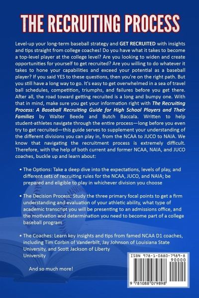 Level-up your long-term baseball strategy and GET RECRUITED with insights and tips straight from college coaches! Do you have what it takes to become a top-level player at the college level? Are you looking to widen and create opportunities for yourself to get recruited? Are you willing to do whatever it takes to hone your capabilities and exceed your potential as a baseball player? If you said YES to these questions, then you're on the right path. But you still have a long way to go. It's easy to get overwhelmed in a sea of travel ball schedules, competition, triumphs, and failures before you get there. After all, the road toward getting recruited is a long and bumpy one. With that in mind, make sure you get your information right with The Recruiting Process: A Baseball Recruiting Guide for High School Players and Their Families by Walter Beede and Butch Baccala. Written to help student-athletes navigate through the entire process-long before you even try to get recruited-this guide serves to supplement your understanding of the different divisions you can play in, from the NCAA to JUCO to NAIA. We know that navigating the recruitment process is extremely difficult. Therefore, with the help of both current and former NCAA, NAIA and JUCO coaches, buckle up and learn about:The Options: Take a deep dive into the expectations, levels of play, and different sets of recruiting rules for the NCAA, JUCO, and NAIA; be prepared and eligible to play in whichever division you choose The Decision Process: Study the three primary focal points to get a firm understanding and evaluation of your athletic ability, what type of academic transcript you will be presenting to an admissions office, and the motivation and determination you need to become part of a college baseball program The Coaches: Learn key insights and tips from famed NCAA D1 coaches, including Tim Corbin of Vanderbilt, Jay Johnson of Louisiana State University, and Scott Jackson of Liberty University And so much more! With you in mind, this guide is both practical and filled with proven strategies! Grab your ocpy of The Recruiting Process, and discover the real secrets behin professional recruiting!