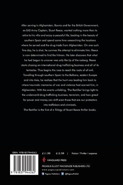 After serving in Afghanistan, Bosnia and for the British Government, ex-SAS Army Captain, Stuart ¿Reece, wanted nothing more than to retire to his villa and enjoy a peaceful life, basking in the ¿beauty of southern Spain and spend some time researching the locations where he served and the ¿drug trade from Afghanistan. On one such fine day, he is shot, he survives the attempt to eliminate ¿him. Reece is now determined to find the hitman. He later discovers that what he had begun to ¿uncover was only the tip of the iceberg. Reece starts chasing an international drug trafficking ¿business and all of its tentacles. Thus begins the race to reach the roots of all evil. Travelling ¿through southern Spain to the Balkans, eastern Europe and into Asia, he realises that the hunt was ¿leading him back to where traumatic memories of war and violence had scarred him, in ¿Afghanistan. With the events unfolding, 'The Rectifier' brings light to the underworld drug ¿trafficking business, terrorism, and how greed for power and money can shift even those that are ¿our protectors into traffickers and criminals. ¿ The Rectifier is the first of a Trilogy of Stuart Reece thriller books. ¿