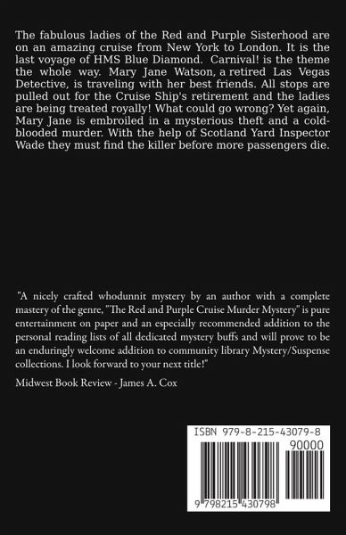 The fabulous ladies of the Red and Purple Sisterhood are on an amazing cruise across the Atlantic from New York to London. It is the last voyage of the glamorous HMS Blue Diamond. The celebratiion is Carnival Time the whole way. Mary Jane Watson, a retired Las Vegas Police Detective, is traveling with her best friends. All the stops are pulled out for the retirement of the cruise ship and the ladies are being treated royally. What could go wrong? Yet again, Mary Jane is embroilrd in a mysterious theft and a cold-blooded murder. With the help of Scotland Yard Inspector, Basil Wade, they must find the killer before more passengers die.