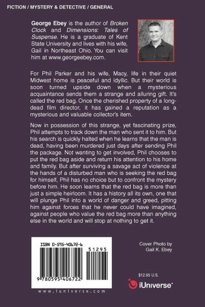 For Phil Parker and his wife, Macy, life in their quiet Midwest home is peaceful and idyllic. But their world is soon turned upside down when a mysterious acquaintance sends them a strange and alluring gift. It's called the red bag. Once the cherished property of a long-dead film director, it has gained a reputation as a mysterious and valuable collector's item. Now in possession of this strange, yet fascinating prize, Phil attempts to track down the man who sent it to him. But his search is quickly halted when he learns that the man is dead, having been murdered just days after sending Phil the package. Not wanting to get involved, Phil chooses to put the red bag aside and return his attention to his home and family. But after surviving a savage act of violence at the hands of a disturbed man who is seeking the red bag for himself, Phil has no choice but to confront the mystery before him. He soon learns that the red bag is more than just a simple heirloom. It has a history all its own, one that will plunge Phil into a world of danger and greed, pitting him against forces that he never could have imagined, against people who value the red bag more than anything else in the world and will stop at nothing to get it.