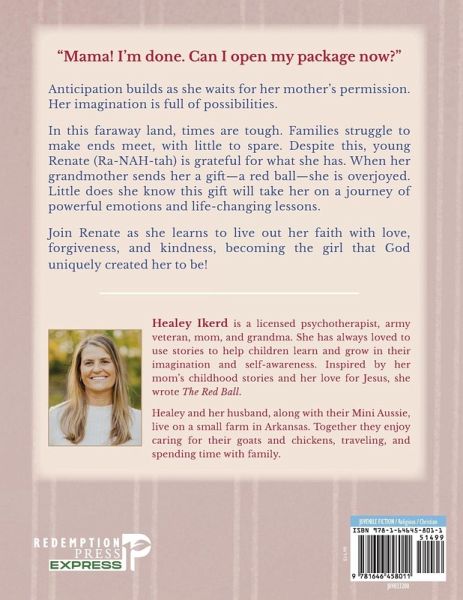 Do you want to teach your child to be someone who shares love and kindness with others? Healey E. Ikerd, a Licensed Counselor and lover of Jesus, teaches through the story of The Red Ball that our decisions can help us be the person that God has called us to be. The story highlights the adventure of a young girl named Renate (Ra-Nah-Tah) who experiences betrayal by a friend and through that betrayal learns about navigating through anger and choosing forgiveness instead. Renate's decision to love her friend proves also to have a profound effect on others around her. Children will see that what God asks of them is also what helps them to be exactly the kind of person they want to be anyway! Readers will not only relate to Renate's many emotions but also adore her sweet spirit of loving others and loving God. The Red Ball is an endearing picture book for readers, ages 6 to 10. It was inspired by a story of a real-life Renate who grew up in East Germany in the 1940's. This picture book makes an excellent:Read aloud story time to help children understand that the choices we make are important. They affect our lives and affect others also. Bedtime story for teaching gratitude, responsibility, love, kindness, and forgiveness. Educational story for counselors, teachers, and parents to introduce valuable concepts of forgiveness, kindness, gratitude, friendship, and emotions. Entertaining story that will make a thoughtful gift for young readers for Easter, Christmas, and Birthdays! Don't Forget the Companion Activity Book! With 30 activities, it is perfect for reinforcing the concepts learned in the book with sections focused on story comprehension, managing emotions, and learning forgiveness and the fruit of the spirit.