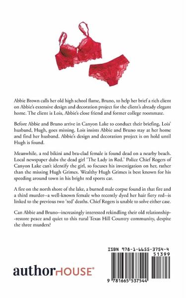 Abbie Brown calls her old high school flame, Bruno, to help her brief a rich client on Abbie's extensive design and decoration project for the client's already elegant home. The client is Lois, Abbie's close friend and former college roommate. Before Abbie and Bruno arrive in Canyon Lake to conduct their briefing, Lois' husband, Hugh, goes missing. Lois insists Abbie and Bruno stay at her home and find her husband. Abbie's design and decoration project is on hold until Hugh is found. Meanwhile, a red bikini and bra-clad female is found dead on a nearby beach. Local newspaper dubs the dead girl 'The Lady in Red.' Police Chief Rogers of Canyon Lake can't identify the girl, so focuses his investigation on her, rather than the missing Hugh Grimes. Wealthy Hugh Grimes is best known for his speeding around town in his bright red sports car. A fire on the north shore of the lake, a burned male corpse found in that fire and a third murder--a well-known female who recently dyed her hair fiery red--is linked to the previous two 'red' deaths. Chief Rogers is unable to solve either case. Can Abbie and Bruno--increasingly interested rekindling their old relationship--restore peace and quiet to this rural Texas Hill Country community, despite the three murders?