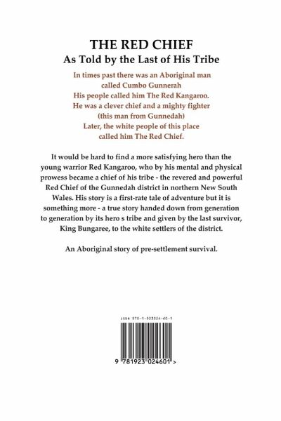 In times past there was an Aboriginal mancalled Cumbo GunnerahHis people called him The Red Kangaroo.He was a clever chief and a mighty fighter(this man from Gunnedah)Later, the white people of this placecalled him The Red Chief. It would be hard to find a more satisfying hero than the young warrior Red Kangaroo, who by his mental and physical prowess became a chief of his tribe - the revered and powerful Red Chief of the Gunnedah district in northern New South Wales. His story is a first-rate tale of adventure but it is something more - a true story handed down from generation to generation by its hero s tribe and given by the last survivor, King Bungaree, to the white settlers of the district. An Aboriginal story of pre-settlement survival.