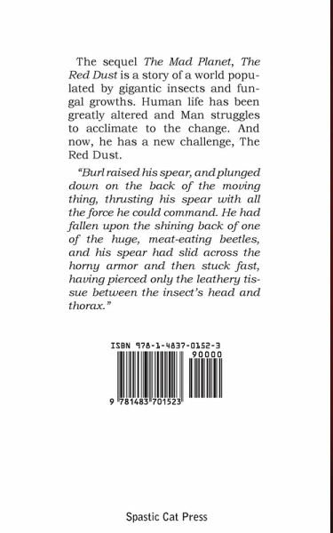 The sequel The Mad Planet, The Red Dust is a story of a world populated by gigantic insects and fungal growths. Human life has been greatly altered and Man struggles to acclimate to the change. And now, he has a new challenge, The Red Dust. "Burl raised his spear, and plunged down on the back of the moving thing, thrusting his spear with all the force he could command. He had fallen upon the shining back of one of the huge, meat-eating beetles, and his spear had slid across the horny armor and then stuck fast, having pierced only the leathery tissue between the insect's head and thorax."
