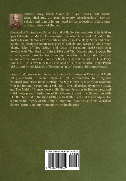 Andrew Lang, (born March 31, 1844, Selkirk, Selkirkshire, Scot.--died July 20, 1912, Banchory, Aberdeenshire), Scottish scholar and man of letters noted for his collections of fairy tales and translations of Homer. Educated at St. Andrews University and at Balliol College, Oxford, he held an open fellowship at Merton College until 1875, when he moved to London. He quickly became famous for his critical articles in The Daily News and other papers. He displayed talent as a poet in Ballads and Lyrics of Old France (1872), Helen of Troy (1882), and Grass of Parnassus (1888) and as a novelist with The Mark of Cain (1886) and The Disentanglers (1902). He earned special praise for his 12-volume collection of fairy tales, the first volume of which was The Blue Fairy Book (1889) and the last The Lilac Fairy Book (1910). His own fairy tales, The Gold of Fairnilee (1888), Prince Prigio (1889), and Prince Ricardo of Pantouflia (1893) became children's classics. Lang also did important pioneer work in such volumes as Custom and Myth (1884) and Myth, Ritual and Religion (1887). Later he turned to history and historical mysteries, notably Pickle the Spy (1897), A History of Scotland from the Roman Occupation, 4 vol. (1900-07), Historical Mysteries (1904), and The Maid of France (1908). His lifelong devotion to Homer produced well-known prose translations of the Odyssey (1879), in collaboration with S.H. Butcher, and of the Iliad (1883), with Walter Leaf and Ernest Myers. He defended the theory of the unity of Homeric literature, and his World of Homer (1910) is an important study. (wikipedia.org)