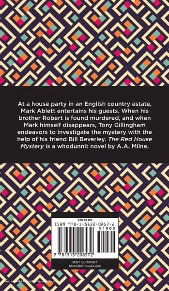 The Red House Mystery (1922) is a detective novel by A.A. Milne. Known more for his series of Winnie-the-Pooh stories and poems for children, Milne also wrote novels and plays for adults, including this successful whodunnit. The Red House Mystery, Milne's only detective novel, was highly successful upon publication and is noted for its use of an amateur sleuth as well as its intricate, puzzle-like plot. Despite earning the ire of Raymond Chandler, Milne's novel was reprinted in the U.S. and in Britain numerous times. At his house in the English countryside, Mark Ablett hosts a small party of diverse guests including a widow and her young daughter, a retired military officer, an actress, and a young socialite named Bill Beverley. During this party, Mark's brother Robert unexpectedly returns home from Australia, where he has been for some time. Shortly after this long-awaited homecoming, Robert is found dead of a gunshot wound to the head, and, amidst the chaos, Mark suddenly disappears. Having arrived late to the party, Tony Gillingham, with the help of his friend Bill Beverley, endeavors to investigate the mysterious events of the evening. Aided, or at least tolerated, by an uninterested police force, Gillingham does his best as an amateur detective to gather evidence leading not only to the identity of Robert's murderer, but to the discovery of Mark's whereabouts. The Red House Mystery is an innovative whodunnit filled with humorous quips, twists and turns, and a puzzle with which even the most seasoned reader of mysteries will struggle. This edition of A.A. Milne's The Red House Mystery is a classic of British detective fiction reimagined for modern readers. Since our inception in 2020, Mint Editions has kept sustainability and innovation at the forefront of our mission. Each and every Mint Edition title gets a fresh, professionally typeset manuscript and a dazzling new cover, all while maintaining the integrity of the original book. With thousands of titles in our collection, we aim to spotlight diverse public domain works to help them find modern audiences. Mint Editions celebrates a breadth of literary works, curated from both canonical and overlooked classics from writers around the globe.