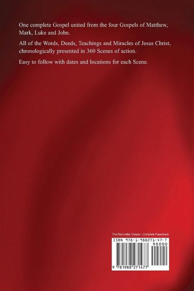 See All The Red Letter Words and Teachings of Jesus Christ in Order. This advanced Four Gospel Harmony and word-for-word Merger was created to focus on the words that Jesus Christ spoke, and it does this by displaying all of His words in bright red letters as they appear within the full Gospel. This book is not a mere list of the Words of Jesus Christ, but it is the complete Gospel story that shows all of His words in full context. With all of the Words and teachings of Jesus Christ displayed in bright red font, it is easy to see everything that He said. In total, almost 48% of the text of this book is the red letter words of Jesus. The unified text of this book is reprinted from the Fifth Column of the Four Gospel Harmony and word-for-word Merger, "FIVE COLUMN: The Synoptic Gospel", which chronologically aligns and unifies all of the sets of parallel verses from the four Gospel accounts according to sixteen-step Harmonization and Merging process. With the overlap and duplication between the parallel sections of verses harmonized on a true word-for-word basis, the resulting clear and easy-to-read unified text is almost 22% shorter to read, compared to reading the four individual Gospel accounts back-to-back. Dates and locations, along with nine Chapter Maps of Israel and of Jerusalem, show when and where each event happened, so that you can follow all of the action as Jesus travelled during the years of His public ministry. These maps highlight the locations that Jesus visited in red. Understanding the meaning and message of the Gospel story is further enhanced with 350+ references to the Old Testament Scriptures, along with the historical people and places that are mentioned. The Red Letter Gospel story divided into ten Chapters, with 360 Scenes of action, so that you can read, study and meditate on one Scene a day, to know the full Gospel story of the Life and message of Jesus Christ in a year! This Complete Edition includes these features: 1. The entire unified Gospel story presented in chronological order 2. Date and Location for each Scene 3. 350+ references to the Old Testament Scriptures, historical figures and places 4. Nine Chapter Maps of Israel and of Jerusalem (with red) 5. Full set of Notes 6. An Overview of The Four Gospels, including the Four Gospels Comparison Chart 7. Seven Articles about the creation and compilation of the Four Gospel Harmony and word-for-word Merger, "FIVE COLUMN: The Synoptic Gospel" 8. The Gospel Verse Cross-Reference Appendix - shows if any verse from the Four Gospels is part of a parallel set, and where that verse is located (with red) A black text edition of this book is available without the red font, titled "The Synoptic Gospel".