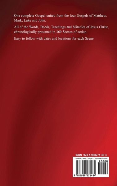 See All The Red Letter Words and Teachings of Jesus Christ in Order. This advanced Four Gospel Harmony and word-for-word Merger was created to focus on the words that Jesus Christ spoke, and it does this by displaying His words in bright red letters as they appear within the full Gospel. This book is not a mere list of the Words of Jesus Christ, but it is the complete Gospel story that shows all of His words in full context. With all of the Words and teachings of Jesus Christ displayed in bright red font, it is easy to see everything that He said. In total, almost 48% of the text of this book is the red letter words of Jesus Christ. The unified text of this book is reprinted from the Fifth Column of the Four Gospel Harmony and word-for-word Merger, "FIVE COLUMN: The Synoptic Gospel", which chronologically aligns and unifies all of the sets of parallel verses from the four Gospel accounts according to sixteen-step Harmonization and Merging process. With the overlap and duplication between the parallel sections of verses harmonized on a true word-for-word basis, the resulting clear and easy-to-read unified text is almost 22% shorter to read, compared to reading the four individual Gospel accounts back-to-back. Dates and locations, along with nine Chapter Maps of Israel and of Jerusalem, show when and where each event happened, so that you can follow all of the action as Jesus travelled during the years of His public ministry. These maps highlight the locations that Jesus visited in red. Understanding the meaning and message of the Gospel story is further enhanced with 350+ references to the Old Testament Scriptures, along with the historical people and places that are mentioned. The Red Letter Gospel story divided into ten Chapters, with 360 Scenes of action, so that you can read, study and meditate on one Scene a day to know the full Gospel story of the Life and message of Jesus Christ in a year! This Complete Edition includes these features: 1. The entire unified Gospel story presented in chronological order 2. Date and Location for each Scene 3. 350+ references to the Old Testament Scriptures, historical figures and places 4. Nine Chapter Maps of Israel and of Jerusalem (with red) 5. Full set of Notes 6. An Overview of The Four Gospels, including the Four Gospels Comparison Chart 7. Seven Articles about the creation and compilation of the Four Gospel Harmony and word-for-word Merger, "FIVE COLUMN: The Synoptic Gospel" 8. The Gospel Verse Cross-Reference Appendix - shows if any verse from the Four Gospels is part of a parallel set, and where that verse is located (with red)