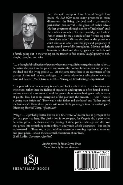 Into the epic sweep of Lars Amund Vaage's long poem The Red Place come many presences in many dimensions: the living, the dead and - part-mythic, part-realist, part-surreal - the ghosts of earlier selves. Mother progresses through a series of 'red places' until she reaches somewhere 'Her feet would go no further.' Father 'stands by me / outside of me / whistling notes / that don't exist.' We see the poet at the piano as a child and as an adult, and the joys and poignancy of music sound powerfully throughout. Moving tenderly between farmland and the city, great concert halls and a family going out in the evening on the tractor to find music, Vaage's poetry is rich, simple, complex, and wise. "… a thoughtful collection of poems whose many qualities emerge in a quiet voice …he writes the past into the present and makes the borders between past and present, the dead and the living porous … At the same time there is an acceptance of the passage of time and the need to forget … a profoundly serious reflection on memory, time and death." (Marit Grøtta, NRK-Norwegian Broadcasting Corporation) "The poet takes us on a journey inwards and backwards in time … the insistence on wholeness, rather than the feeling of separation and rupture so often found in modernism, means that we come to read the poems about remembering not only in terms of painful loss, but as an inscription of the past into the present. … Read 'There is a young man inside me', 'How was it with father and the horse' and 'Father created the landscape'. These three poems will most likely go straight into the anthologies." (Henning Howlid Wærp, Aftenposten) "Vaage … is probably better known as a fine writer of novels, but is perhaps at his best as a poet - as here. The distinction is not so great, for Vaage is also a poet when he writes prose. The themes are the passing of time, parents who age and die, love that grows into something more ordinary, and youth which disappears - but can be rediscovered … These are, in part, sublime sequences - coming together to make up one great poem - about the existential conditions of our lives." (Eirik Lodén, Stavanger Aftenblad)
