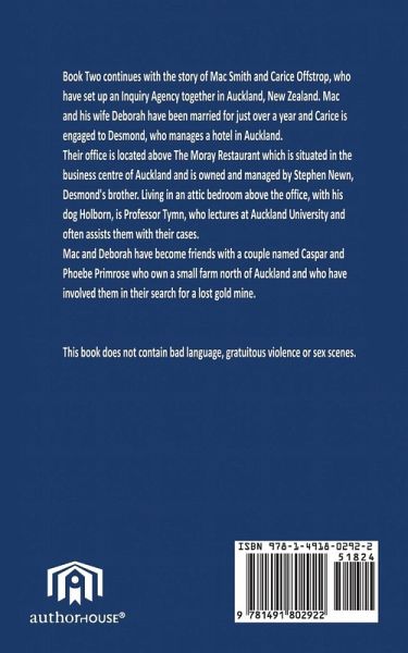 Book 2 continues with the story of Mac Smith and Carice Offstrop, who have set up an inquiry agency together in Auckland, New Zealand. Mac and his wife, Deborah, have been married for just over a year, and Carice is engaged to Desmond, who manages a hotel in Auckland. Their office is located above the Moray Restaurant, which is situated in the business centre of Auckland and is owned and managed by Stephen Newn, Desmond's brother. Living in an attic bedroom above the office with his dog, Holborn, is Professor Tymn, who lectures at Auckland University and often assists them with their cases. Mac and Deborah have become friends with a couple named Caspar and Phoebe Primrose, who own a small farm north of Auckland and who have involved them in their search for a lost gold mine. This book does not contain bad language, gratuitous violence, or sex scenes.