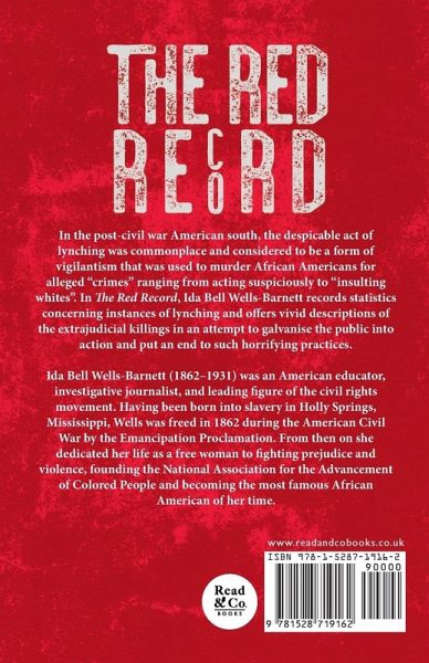 In the post-civil war American south, the despicable act of lynching was commonplace and considered to be a form of vigilantism that was used to murder African Americans for alleged "crimes" ranging from acting suspiciously to "insulting whites". In "The Red Record", Ida Bell Wells-Barnett records statistics concerning instances of lynching and offers vivid descriptions of the extrajudicial killings in an attempt to galvanise the public into action and put an end to such horrifying practices. Ida Bell Wells-Barnett (1862-1931) was an American educator, investigative journalist, and leading figure of the civil rights movement. Having been born into slavery in Holly Springs, Mississippi, Wells was freed in 1862 during the American Civil War by the Emancipation Proclamation. From then on she dedicated her life as a free woman to fighting prejudice and violence, founding the National Association for the Advancement of Colored People and becoming the most famous African American of her time. Contents include: "The Case Stated", "Lynch-Law Statistics", "Lynching Imbeciles (An Arkansas Butchery)", "Lynching of Innocent Men (Lynched on Account of Relationship)", "Lynched for Anything or Nothing (Lynched for Wife Beating)", "History of Some Cases of Rape", "The Crusade Justified (Appeal from America to the World)", "Miss Willard's Attitude", "Lynching Record for 1894", and "The Remedy". Other notable works by this author include: "Southern Horrors: Lynch Law in All its Phases" (1892) and "Mob Rule in New Orleans" (1900). Read & Co. History is proudly republishing this classic work now in a brand new edition complete with introductory chapters by Irvine Garland Penn and T. Thomas Fortune.