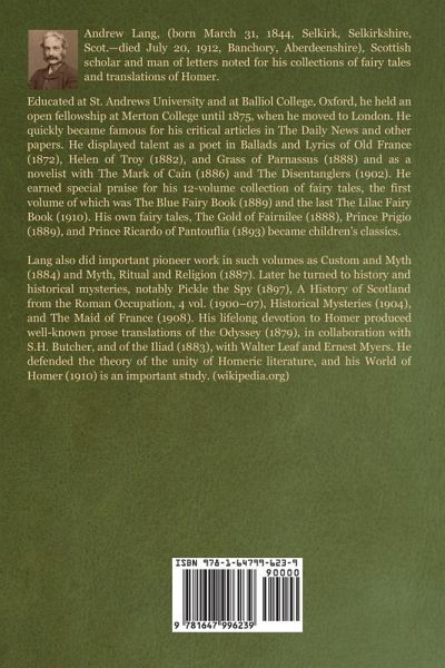 Andrew Lang (1844 - 1912) was a Scottish poet, novelist, literary critic and contributor to the field of anthropology. He is best known as a collector of folk and fairy tales. The Andrew Lang lectures at the University of St Andrews are named after him. Lang is now chiefly known for his publications on folklore, mythology and religion. The interest in folklore was from early life; he read John Ferguson McLennan before coming to Oxford, and then was influenced by E. B. Tylor. The earliest of his publications is Custom and Myth (1884). In Myth, Ritual and Religion (1887) he explained the "irrational" elements of mythology as survivals from more primitive forms. Lang's Making of Religion was heavily influenced by the 18th century idea of the "noble savage": in it, he maintained the existence of high spiritual ideas among so-called "savage" races, drawing parallels with the contemporary interest in occult phenomena in England. His Blue Fairy Book (1889) was a beautifully produced and illustrated edition of fairy tales that has become a classic. This was followed by many other collections of fairy tales, collectively known as Andrew Lang's Fairy Books. In the preface of the Lilac Fairy Book he credits his wife with translating and transcribing most of the stories in the collections. Lang examined the origins of totemism in Social Origins (1903).