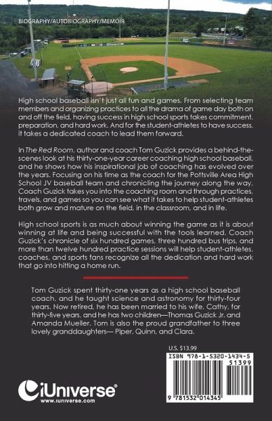 High school baseball isn't just all fun and games. From selecting team members and organizing practices to all the drama of game day both on and off the field, having success in high school sports takes commitment, preparation, and hard work. And for the student-athletes to have success, it takes a dedicated coach to lead them forward. In The Red Room, author and coach Tom Guzick provides a behind-thescenes look at his thirty-one-year career coaching high school baseball, and he shows how his inspirational job of coaching has evolved over the years. Focusing on his time as the coach for the Pottsville Area High School JV baseball team and chronicling the journey along the way, Coach Guzick takes you into the coaching room and through practices, travels, and games so you can see what it takes to help student-athletes both grow and mature on the field, in the classroom, and in life. High school sports is as much about winning the game as it is about winning at life and being successful with the tools learned. Coach Guzick's chronicle of six hundred games, three hundred bus trips, and more than twelve hundred practice sessions will help student-athletes, coaches, and sports fans recognize all the dedication and hard work that go into hitting a home run.