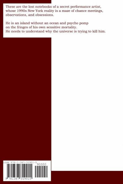 These are the lost notebooks of a secret performance artist, whose 1990s New York reality is a maze of chance meetings, observations, and obsessions. He is an island without an ocean and psycho pomp on the fringes of his own sensitive mortality. He needs to understand why the universe is trying to kill him.