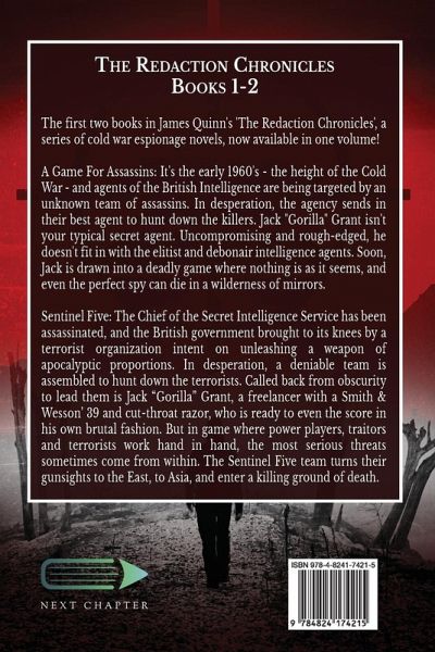 The first two books in James Quinn's 'The Redaction Chronicles', a series of cold war espionage novels, now available in one volume! A Game For Assassins: It's the early 1960's - the height of the Cold War - and agents of the British Intelligence are being targeted by an unknown team of assassins. In desperation, the agency sends in their best agent to hunt down the killers. Jack "Gorilla" Grant isn't your typical secret agent. Uncompromising and rough-edged, he doesn't fit in with the elitist and debonair intelligence agents. Soon, Jack is drawn into a deadly game where nothing is as it seems, and even the perfect spy can die in a wilderness of mirrors. Sentinel Five: The Chief of the Secret Intelligence Service has been assassinated, and the British government brought to its knees by a terrorist organization intent on unleashing a weapon of apocalyptic proportions. In desperation, a deniable team is assembled to hunt down the terrorists. Called back from obscurity to lead them is Jack "Gorilla" Grant, a freelancer with a Smith & Wesson' 39 and cut-throat razor, who is ready to even the score in his own brutal fashion. But in game where power players, traitors and terrorists work hand in hand, the most serious threats sometimes come from within. The Sentinel Five team turns their gunsights to the East, to Asia, and enter a killing ground of death.