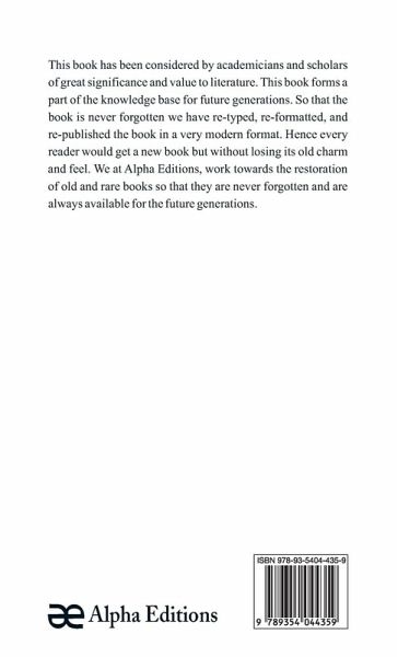 This book has been considered by academicians and scholars of great significance and value to literature. This book forms a part of the knowledge base for future generations. So that the book is never forgotten we have re-typed, re-formatted, and re-published the book in a very modern format. Hence every reader would get a new book but without losing its old charm and feel. We at Alpha Editions, work towards the restoration of old and rare books so that they are never forgotten and are always available for the future generations.