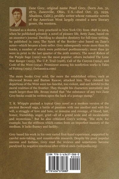 Zane Grey, original name Pearl Grey, (born Jan. 31, 1872, Zanesville, Ohio, U.S.—died Oct. 23, 1939, Altadena, Calif.), prolific writer whose romantic novels of the American West largely created a new literary genre, the western. Trained as a dentist, Grey practiced in New York City from 1898 to 1904, when he published privately a novel of pioneer life, Betty Zane, based on an ancestor’s journal. Deciding to abandon dentistry for full-time writing, he published in 1905 The Spirit of the Border—also based on Zane’s notes—which became a best-seller. Grey subsequently wrote more than 80 books, a number of which were published posthumously; more than 50 were in print in the last quarter of the 20th century. The novel Riders of the Purple Sage (1912) was the most popular; others included The Lone Star Ranger (1915), The U.P. Trail (1918), Call of the Canyon (1924), and Code of the West (1934). Prominent among his nonfiction works is Tales of Fishing (1925). (britannica.com) The more books Grey sold, the more the established critics, such as Heywood Broun and Burton Rascoe, attacked him. They claimed his depictions of the West were too fanciful, too violent, and not faithful to the moral realities of the frontier. They thought his characters unrealistic and much larger-than-life. Broun stated that "the substance of any two Zane Grey books could be written upon the back of a postage stamp." T. K. Whipple praised a typical Grey novel as a modern version of the ancient Beowulf saga, a battle of passions with one another and with the will, a struggle of love and hate, or remorse and revenge, of blood, lust, honor, friendship, anger, grief—all of a grand scale and all incalculable and mysterious." But he also criticized Grey's writing, "His style, for example, has the stiffness which comes from an imperfect mastery of the medium. It lacks fluency and facility. Grey based his work in his own varied first-hand experience, supported by careful note-taking, and considerable research. Despite his great popular success and fortune, Grey read the reviews and sometimes became paralyzed by negative emotions after critical ones. (wikipedia.org)