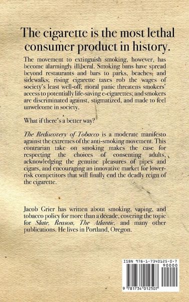 The cigarette is the most lethal consumer product in history. The movement to extinguish smoking, however, has become alarmingly illiberal. Smoking bans have spread beyond restaurants and bars to parks, beaches, and sidewalks; rising cigarette taxes rob the wages of society's least well-off; moral panic threatens smokers' access to potentially life-saving e-cigarettes; and smokers are discriminated against, stigmatized, and made to feel unwelcome in society. What if there's a better way? The Rediscovery of Tobacco is a moderate manifesto against the extremes of the anti-smoking movement. This contrarian take on smoking makes the case for respecting the choices of consenting adults, acknowledging the genuine pleasures of pipes and cigars, and encouraging an innovative market for lower-risk competitors that will finally end the deadly reign of the cigarette.