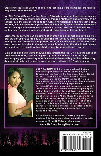Stars shine bursting with heat and light just like before diamonds are formed, they must be refined by fire! In "The Refined Being," author Star K. Edwards wears her heart on her pen as she passionately recounts her journey through obstacles and adversity to be refined into the person she is today. Achieving wholeness has not come easy for Star, who suffered through a series of life altering events and unawareness of the healing she needed which led her to fall for toxic situations before embracing the deep wounds which would later become her battle cry. Momentarily carrying out a posture of triumph and accomplishment as well, Star was forced to battle back through the fire, being refined in her mind, body and spirit. Her resilience recaptured the urgency she once had to overcome even more so, in order to demolish the cycle of unintentionally inflicted causes to defeat and to prevail for her children and for generations to come. Diamonds don't shine until they've been through the fire. Dive into the pages of "The Refined Being" and be inspired by Star as she walks you through encouraging your own story of refinement while unveiling her incredible story, demonstrating how to emerge from the storm shining like God's diamond.