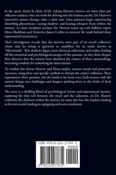 In the quiet, dimly lit clinic of Dr. Adrian Harrow, mirrors are more than just reflective surfaces; they are tools for delving into the human psyche. Dr. Harrow's innovative mirror therapy takes a dark turn when patients begin experiencing disturbing phenomena-seeing shadows and hearing whispers from within the mirrors. As these incidents escalate, Dr. Harrow teams up with folklore expert Elena Markham and Detective James Corbin to uncover the truth behind these supernatural occurrences. Their investigation reveals that the mirrors, once part of an occult collector's estate, may be acting as gateways or amplifiers for an entity known as "Mirrormask." This shadowy figure exists between reflections and reality, feeding off the emotional and psychological energies of the patients. As they delve deeper, they discover that the mirrors have absorbed the essence of their surroundings, becoming conduits for something far more sinister. To combat this threat, Harrow and Elena employ ancient rituals and protective measures, using silver and specific symbols to disrupt the entity's influence. Their experiments show promise, but the battle is far from over. Each session with the mirrors brings new challenges and dangers, pushing them to the brink of their understanding. The story is a thrilling blend of psychological horror and supernatural mystery, exploring the thin veil between the mind and the unknown. As Dr. Harrow confronts the darkness within the mirrors, he must also face the shadows lurking in his own mind, leading to a gripping and eerie conclusion.