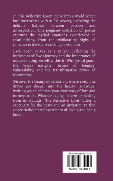 In "The Reflective Lover," delve into a world where love intertwines with self-discovery, exploring the delicate balance between passion and introspection. This poignant collection of poems captures the myriad emotions experienced in relationships, from the exhilarating highs of romance to the soul-searching lows of loss. Each poem serves as a mirror, reflecting the intricacies of love's journey and the importance of understanding oneself within it. With lyrical grace, the verses navigate themes of longing, vulnerability, and the transformative power of connection. Discover the beauty of reflection, where every line draws you deeper into the heart's landscape, inviting you to embrace your own story of love and introspection. Whether falling in love or healing from its wounds, "The Reflective Lover" offers a sanctuary for the heart and an invitation to find solace in the shared experience of loving and being loved.