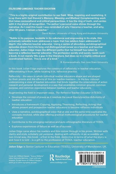 In this book Julian Edge explores the construct of reflexivity in teacher education, differentiating it from, while locating it in, reflective practice. Reflexivity is the key concept underpinning a view of teacher education that binds together the orientations of action research and personal development in a way that establishes common ground, common purpose, and common experience between teachers and teacher educators. Augmenting the field in important ways, The Reflexive Teacher Educator in TESOL: develops the concept of praxis as it resolves the usual theory/practice dichotomy of teacher education introduces a framework (Copying, Applying, Theorising, Reflecting, Acting) that allows present and prospective teacher educators to become reflexive individuals uses a narrative, autobiographical voice that explicates the concepts involved, while also offering practical methodological procedures for teacher education. Written with clarity and style, scholarly yet personal, dealing with reflexivity in an accessible yet non-trivial way, this book - a first in the field, distinctive in terms of what the story is and how it is told - is a gift to the profession of TESOL teacher education.